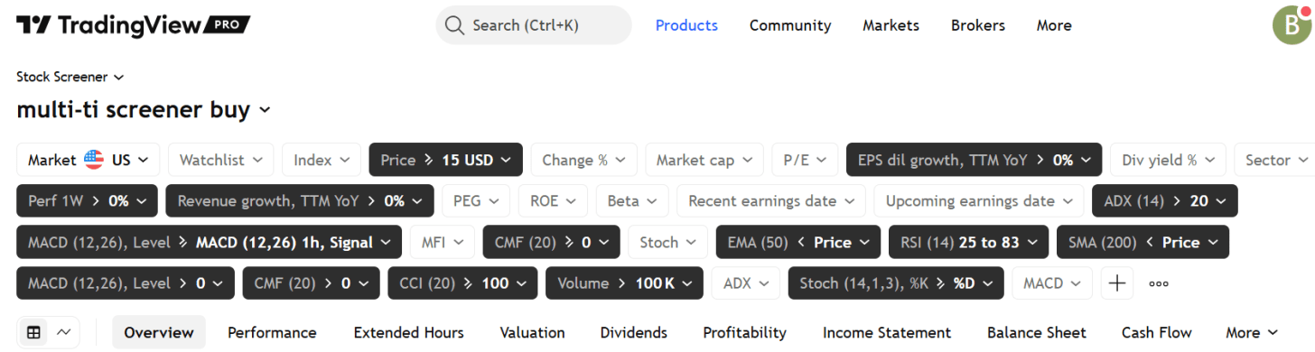 This momentum screener is here, and it’s a little looser than I had it initially because I then screen it with a set of TradingView technical indicators here: